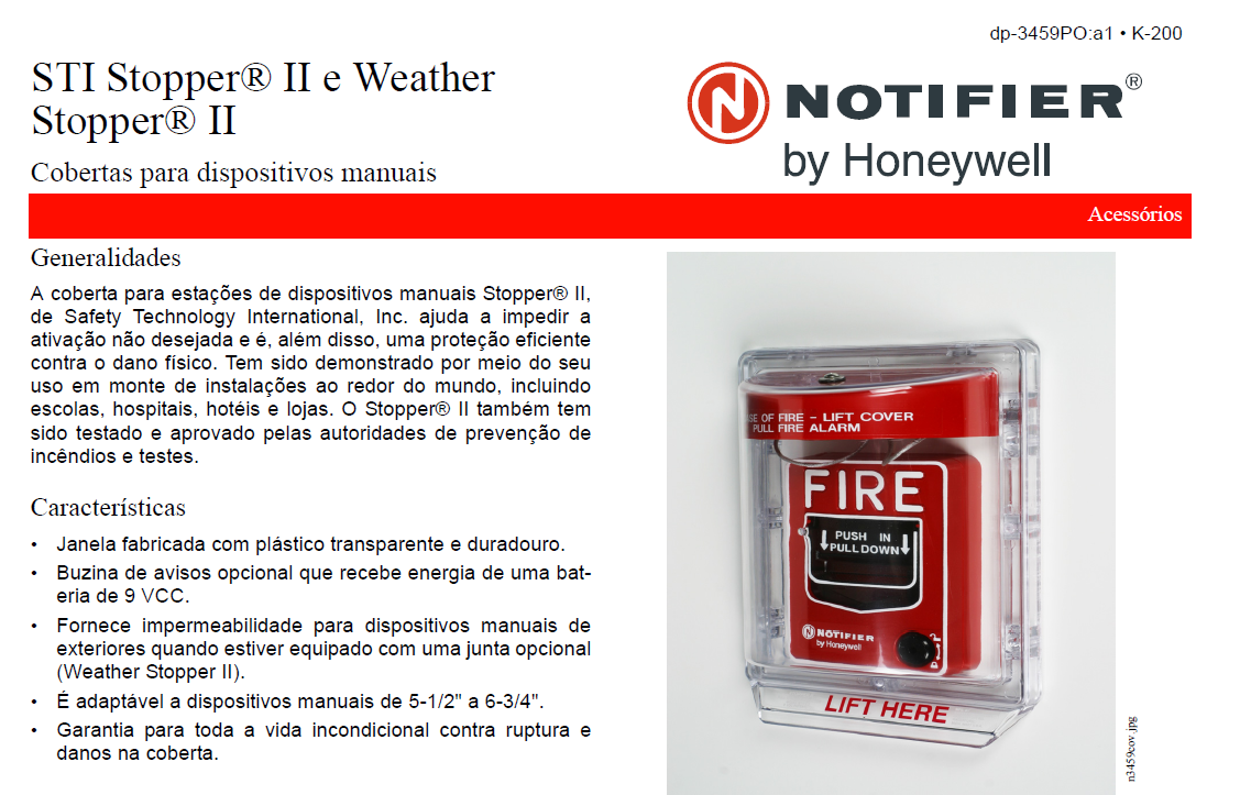A coberta para estações de dispositivos manuais Stopper® II, de Safety Technology International, Inc. ajuda a impedir a ativação não desejada e é, além disso, uma proteção eficiente contra o dano físico. Tem sido demonstrado por meio do seu uso em monte de instalações ao redor do mundo, incluindo escolas, hospitais, hotéis e lojas. O Stopper® II também tem sido testado e aprovado pelas autoridades de prevenção de incêndios e testes.