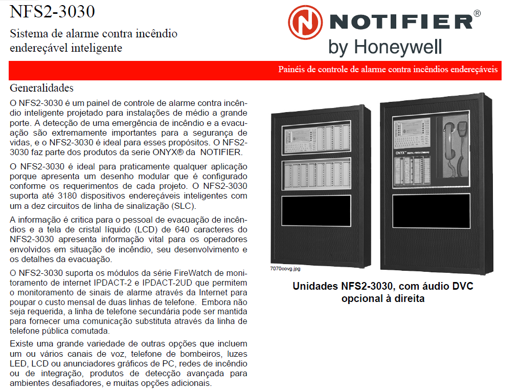 O NFS2-3030 é um inteligente Painel de Alarme de Incêndios projetado para instalações de média e grande escala. A detecção e a evacuação de emergência de incêndio são extremamente importantes para a segurança de vida e o NFS2-3030 é idealmente adequado para tais aplicações. O NFS2-3030 é parte da série ONYX® de produtos da NOTIFIER. O NFS2-3030 é ideal para virtualmente qualquer aplicação, pois possui um design modular que é configurado conforme os requerimentos de projeto. Com um a fez Circuitos de Linha de Sinalização (SLCs), o NFS2-3030 suporta até 3.180 dispositivos de direcionamento inteligentes.