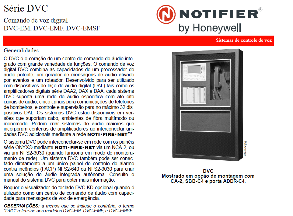 O DVC é o coração de um centro de comando de áudio integrado com grande variedade de funções. O comando de voz digital DVC combina as capacidades de um processador de áudio potente, um gerador de mensagens de áudio ativado por eventos e um roteador. Desenvolvido para ser utilizado com dispositivos de laço de áudio digital (DAL) tais como os amplificadores digitais série DAA2, DAX e DAA, cada sistema DVC suporta uma rede de áudio específica com até oito canais de áudio, cinco canais para comunicações de telefones de bombeiros, e controle e supervisão para no máximo 32 dispositivos DAL. Os sistemas DVC estão disponíveis em versões que suportam cabo, ambientes de fibra multímodo ou monomodo. Podem criar sistemas de áudio maiores que incorporam centenas de amplificadores ao interconectar unidades DVC adicionais mediante a rede NOTI•FIRE•NET™.