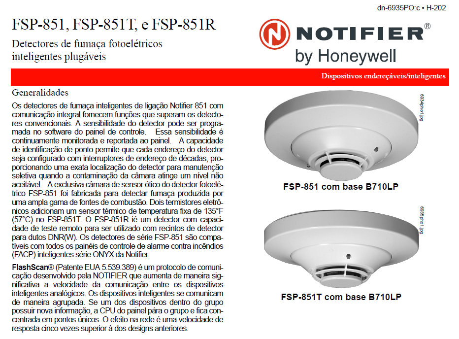 Os detectores de fumaça inteligentes de ligação Notifier 851 com comunicação integral fornecem funções que superam os detectores convencionais. A sensibilidade do detector pode ser programada no software do painel de controle. Essa sensibilidade é continuamente monitorada e reportada ao painel. A capacidade de identificação de ponto permite que cada endereço do detector seja configurado com interruptores de endereço de décadas, proporcionando uma exata localização do detector para manutenção seletiva quando a contaminação da câmara atinge um nível não aceitável. A exclusiva câmara de sensor ótico do detector fotoelétrico FSP-851 foi fabricada para detectar fumaça produzida por uma ampla gama de fontes de combustão. Dois termistores eletrônicos adicionam um sensor térmico de temperatura fixa de 135°F (57°C) no FSP-851T. O FSP-851R ié um detector com capacidade de teste remoto para ser utilizado com recintos de detector para dutos DNR(W). Os detectores de série FSP-851 são compatíveis com todos os painéis de controle de alarme contra incêndios (FACP) inteligentes série ONYX da Notifier.