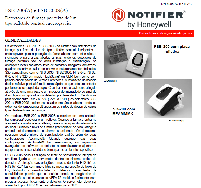 Os modelos FSB-200 e FSB-200S consistem de uma unidade transmissora/receptora e um refletor. Quando a fumaça entra na área entre a unidade e o refletor, causa a redução da intensidade do sinal. Quando o nível de fumaça (intensidade do sinal) atinge o umbral pré-determinado, o alarme é acionado. Os detectores possuem quatro níveis de sensibilidade padrão além de duas configurações Acclimate®. Quando qualquer das duas configurações Acclimate® for selecionada, os algoritmos avançados do software do detector automaticamente ajustam o equipamento na sensibilidade ótima para o ambiente específico.