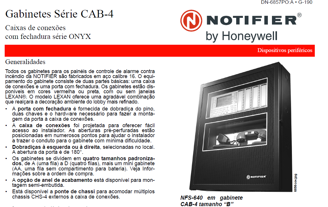 Todos os gabinetes para os painéis de controle de alarme contra incêndio da NOTIFIER são fabricados em aço calibre 16. O equipamento do gabinete consiste de duas partes básicas: uma caixa de conexões e uma porta com fechadura. Os gabinetes estão disponíveis em cores vermelha ou preta, com ou sem janelas LEXAN®. O modelo LEXAN oferece uma agradável combinação que realçará a decoração ambiente do lobby mais refinado.