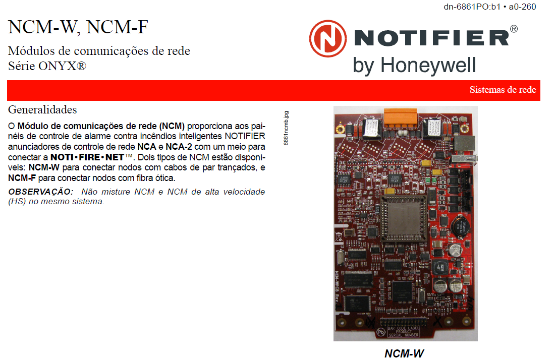 O Módulo de comunicações de rede (NCM) proporciona aos painéis de controle de alarme contra incêndios inteligentes NOTIFIER anunciadores de controle de rede NCA e NCA-2 com um meio para conectar a NOTI•FIRE•NET™. Dois tipos de NCM estão disponíveis: NCM-W para conectar nodos com cabos de par trançados, e NCM-F para conectar nodos com fibra ótica.