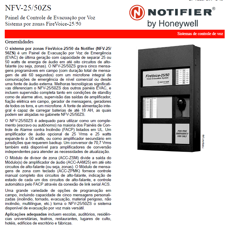 O sistema por zonas FireVoice-25/50 da Notifier (NFV-25/50ZS) é um Painel de Evacuação por Voz de Emergência (EVAC) de última geração com capacidade de separar 25 ou 50 watts de energia de áudio em até oito circuitos de altofalante (ou seja, zonas). O NFV-25/50ZS grava cinco mensagens programáveis em campo (com duração total de mensagem de até 60 segundos) com um microfone integral de comunicações de emergência de nível comercial ou desde uma fonte de áudio externa. Melhoras tecnológicas significativas diferenciam o NFV-25/50ZS dos outros painéis EVAC, e incluem supervisão completa tanto em condições de standby como de alarme ativo, supervisão das saídas de amplificador, fiação elétrica em campo, gerador de mensagens, geradores de todos os tons, e um microfone. A fonte de alimentação integral é capaz de carregar baterias de atè 18 AH, as quais podem ser alojadas no gabinete NFV-25/50ZS.