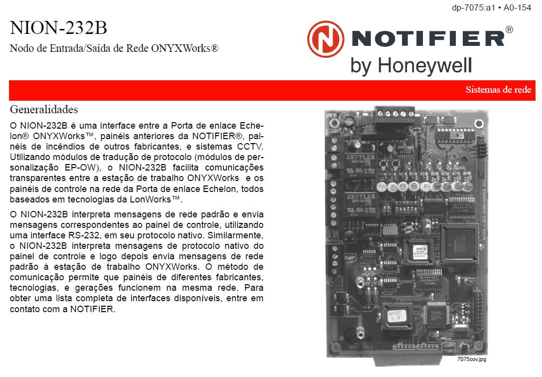 O NION-232B é uma interface entre a Porta de enlace Echelon® ONYXWorks™, painéis anteriores da NOTIFIER®, painéis de incêndios de outros fabricantes, e sistemas CCTV.