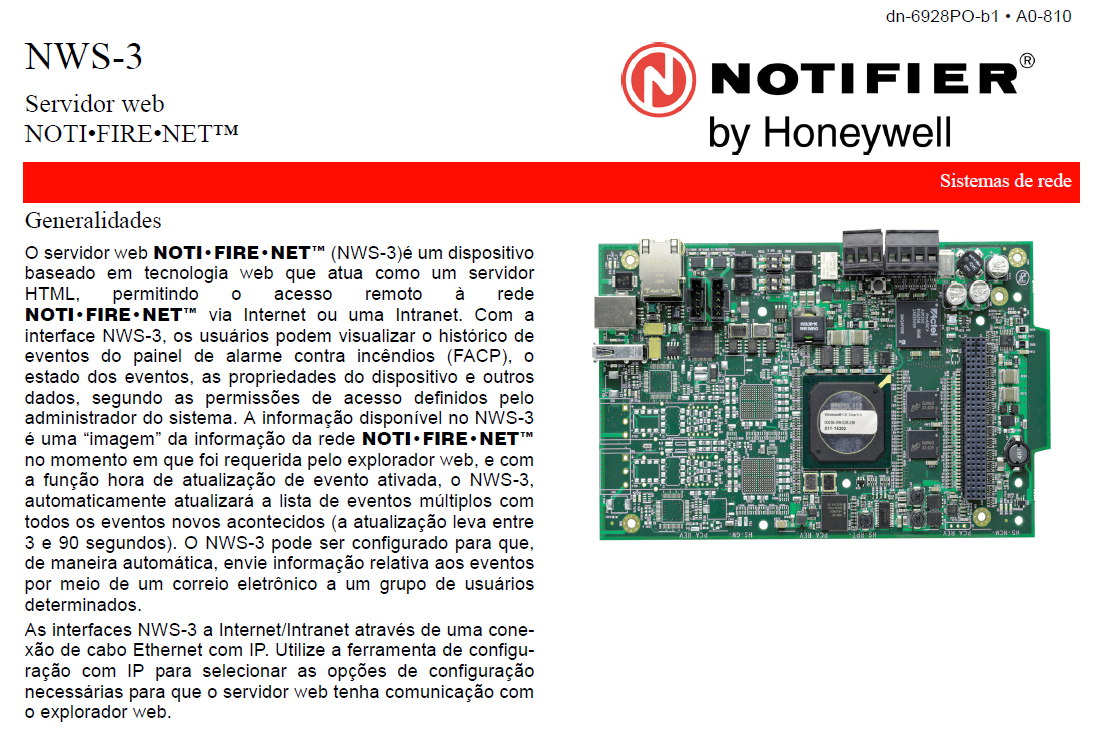 O servidor web NOTI•FIRE•NET™ (NWS-3)é um dispositivo baseado em tecnologia web que atua como um servidor HTML, permitindo o acesso remoto à rede NOTI•FIRE•NET™ via Internet ou uma Intranet. Com a interface NWS-3, os usuários podem visualizar o histórico de eventos do painel de alarme contra incêndios (FACP), o estado dos eventos, as propriedades do dispositivo e outros dados, segundo as permissões de acesso definidos pelo administrador do sistema. A informação disponível no NWS-3 é uma “imagem” da informação da rede NOTI•FIRE•NET™ no momento em que foi requerida pelo explorador web, e com a função hora de atualização de evento ativada, o NWS-3, automaticamente atualizará a lista de eventos múltiplos com todos os eventos novos acontecidos (a atualização leva entre 3 e 90 segundos). O NWS-3 pode ser configurado para que, de maneira automática, envie informação relativa aos eventos por meio de um correio eletrônico a um grupo de usuários determinados.