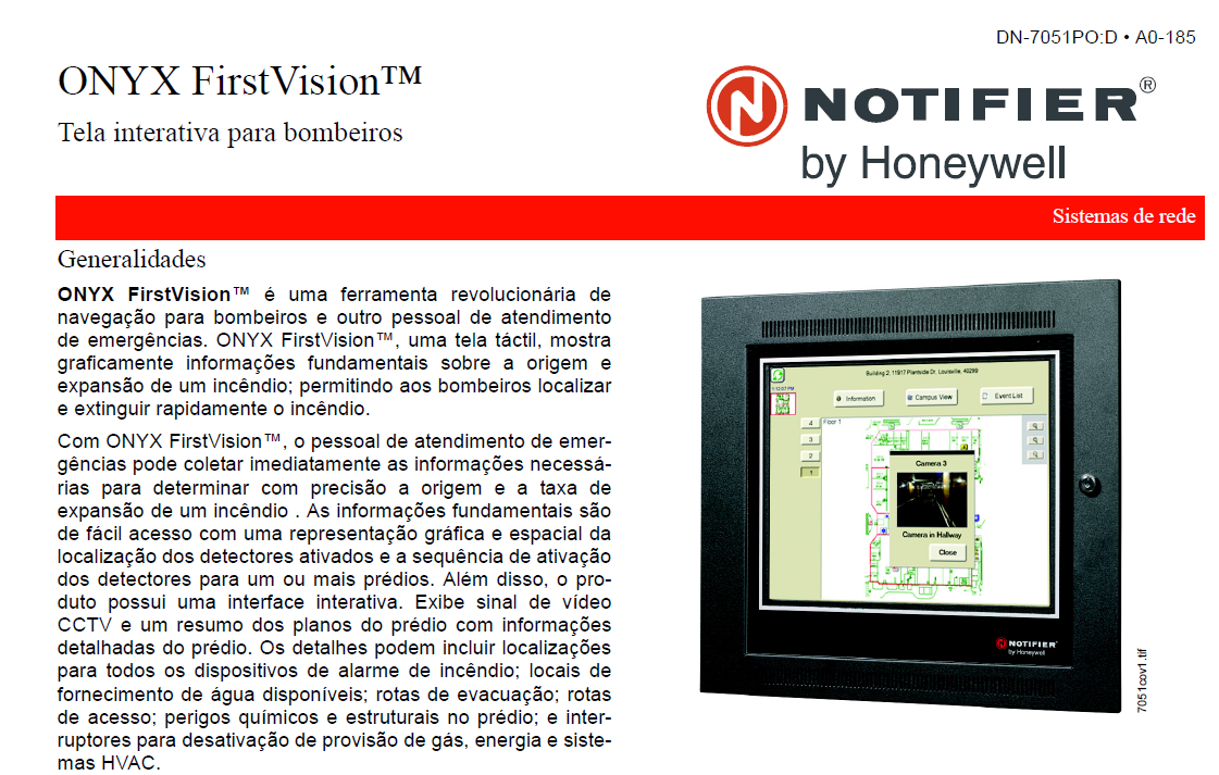 ONYX FirstVision™ é uma ferramenta revolucionária de navegação para bombeiros e outro pessoal de atendimento de emergências. ONYX FirstVision™, uma tela táctil, mostra graficamente informações fundamentais sobre a origem e expansão de um incêndio; permitindo aos bombeiros localizar e extinguir rapidamente o incêndio. Com ONYX FirstVision™, o pessoal de atendimento de emergências pode coletar imediatamente as informações necessárias para determinar com precisão a origem e a taxa de expansão de um incêndio . As informações fundamentais são de fácil acesso com uma representação gráfica e espacial da localização dos detectores ativados e a sequência de ativação dos detectores para um ou mais prédios. Além disso, o produto possui uma interface interativa. Exibe sinal de vídeo CCTV e um resumo dos planos do prédio com informações detalhadas do prédio. Os detalhes podem incluir localizações para todos os dispositivos de alarme de incêndio; locais de fornecimento de água disponíveis; rotas de evacuação; rotas de acesso; perigos químicos e estruturais no prédio; e interruptores para desativação de provisão de gás, energia e sistemas HVAC.